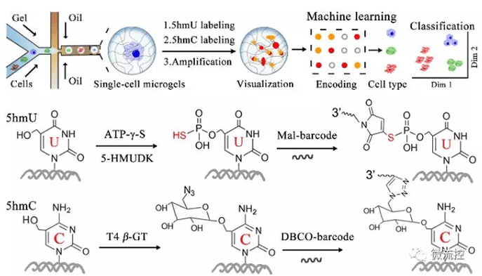 然而,5hmU的化學結構與5hmC高度相似,且其細胞豐度不到后者的1%.因此,兩者的特異識別、區分極其困難,更無法在單細胞水平分析并探究其細胞功能單細胞5hmU/5hmC單分子可視化分析示意圖針對上述問題,西安交通大學生命學院生命分析化學與儀器研究所趙永席教授團隊發展了可特異區分5hmU與5hmC的化學酶(chemoenzymatic)標記法,并構建單細胞凝膠液滴微流控DNA擴增檢測系統,實現單細胞5hmU/5hmC的單分子可視化分析,揭示細胞類型特異的表觀修飾位點數目、分布規律等分子特征,并利用深度學習算法,首次證實5hmU與5hmC可作為標志物,區分正常、致癌、高度轉移的乳腺細胞系相關成果以《微流凝膠編碼的單細胞5hmU/5hmC可視化分析》 (Differentiated Visualization of Single-Cell 5Hydroxymethylpyrimidines with Microfluidic Hydrogel Encoding)為題發表在國際化學領域權威期刊《美國化學會志》(Journal of the American Chemical Society)上.