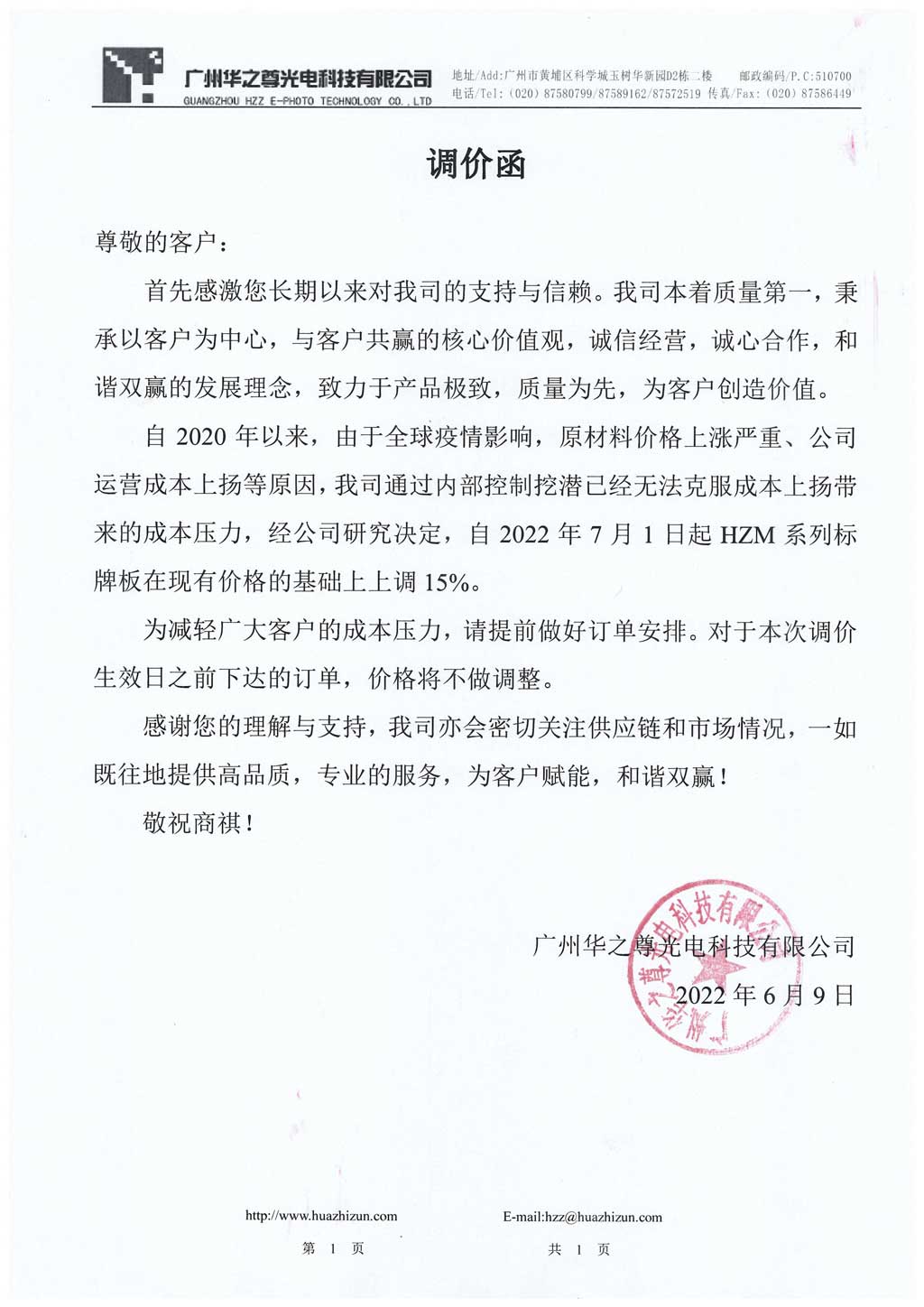 自2020年以來,由于全球疫情影響,原材料價(jià)格上漲嚴(yán)重、公司運(yùn)營成本上揚(yáng)等原因,我司通過內(nèi)部控制挖潛已經(jīng)無法克服成本上揚(yáng)帶來的成本壓力,經(jīng)公司研究決定,自2022年7月1日起HZM系列標(biāo)牌板在現(xiàn)有價(jià)格的基礎(chǔ)上上調(diào)15%。